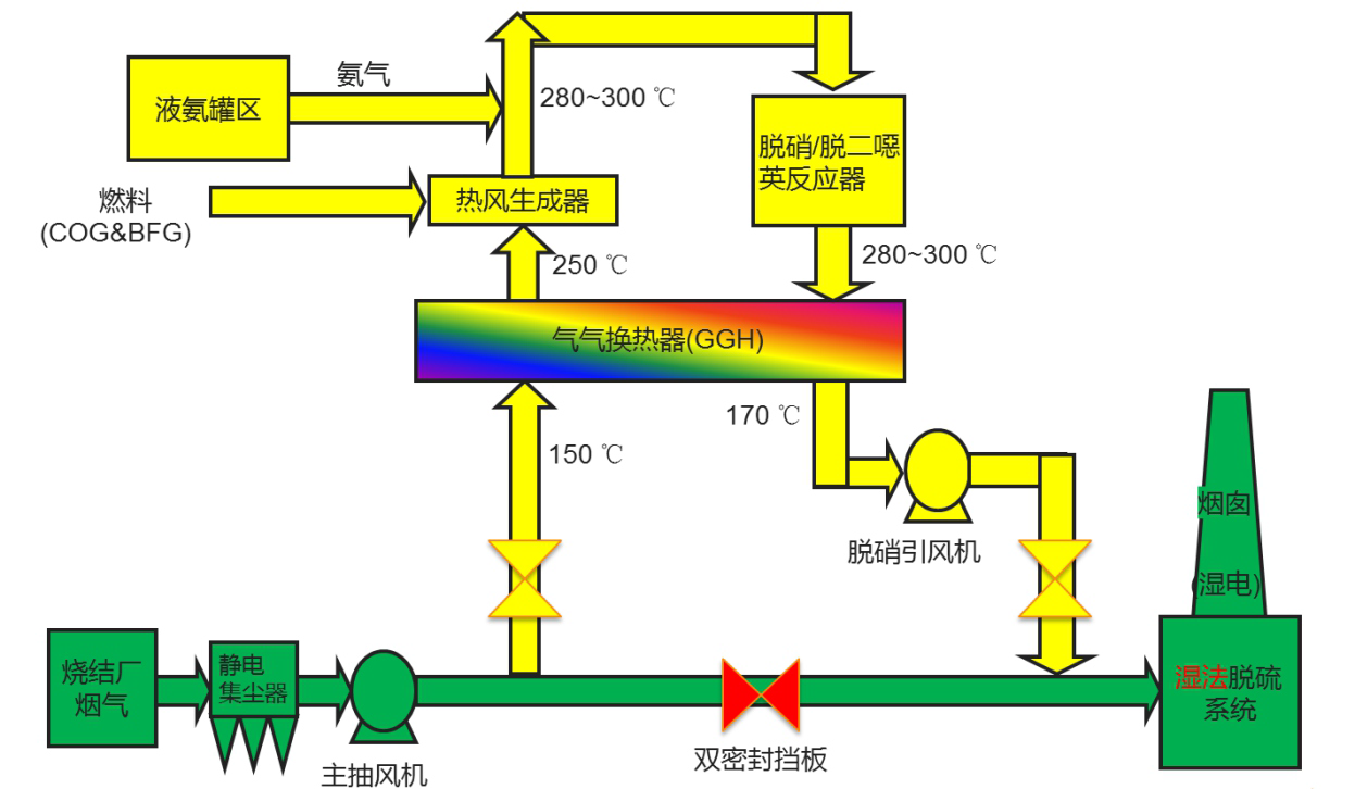 燒結煙氣先經過GGH煙氣換熱器預熱后,在煙道中與加熱爐產生的高溫煙氣混合進一步升溫,繼而與稀釋風機送入的氨空氣混合氣混合,進入SCR反應器進行脫硝、脫二噁英反應,之后煙氣由引風機引入出口煙道排放。