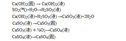 當工藝水經過雙流體噴嘴在反應器中霧化,并與煙氣充分接觸,煙氣冷卻并增濕,氫氧化鈣粉顆粒H2O、SO2、H2SO3反應生成干粉產物,整個反應分為氣相、液相和固相三種狀態反應,方程式如下: