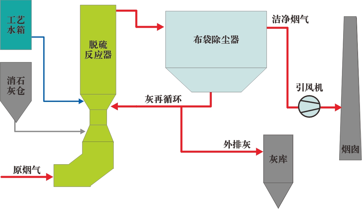從鍋爐出來的原煙氣經反應器底部進入反應器,在文丘管前后和通過空氣斜槽送入反應器的吸收劑及布袋除塵器除下的循環灰混合。經過文丘里管的氣流沖刷,煙氣、吸收劑和循環灰充分混合后進入反應器的直筒段。在文丘里管有出口擴管段設有噴水裝置,噴入霧化水以降低脫硫塔內的煙溫至高于煙氣水露點15℃左右,在降溫和增濕的條件下,煙氣中的SO2與吸收劑反應生成亞硫酸鈣和硫酸鈣。反應后的煙氣攜帶大量的干燥固體顆粒進入布袋除塵器,經過反應,干燥的循環灰被布袋除塵器從煙氣中分離出來,由輸送設備再輸回反應器再次循環反應。潔凈后的煙氣溫度不低于煙氣水露點溫度15℃,無須再熱,經過引風機排入煙囪。