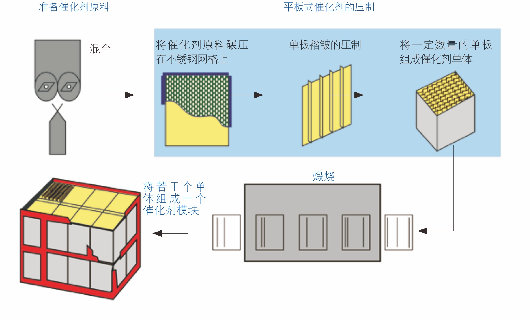 通過進口全自動的涂覆生產線,泥料被均勻地涂覆在不銹鋼擴張網表面,并經紅外干燥,壓制成型,自動切割、機械手包裝等工序,將催化劑平板組裝成單元箱體;陳腐后通過連續式網帶焙燒爐煅燒活化,經檢驗合格,組裝成催化劑模塊,包裝發貨至項目現場。