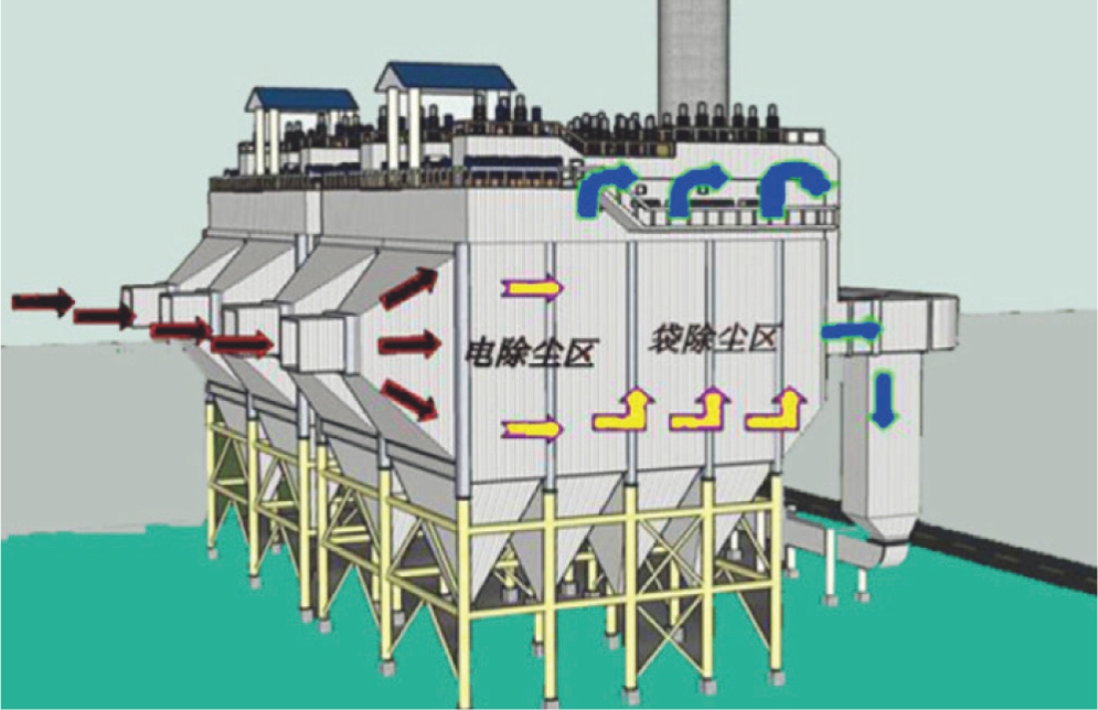 電袋復合除塵器是指在一個箱體內合理安裝電除塵區和濾袋區,有機結合靜電除塵和過濾除塵兩種機理的一種除塵器。通常為前面設置電除塵區,后面設置濾袋區,二者為串聯布置。電除塵區通過陰極放電、陽極收塵,能收集煙氣中大部分粉塵,收塵效率大于85%,同時對未來收集下來的微細粉塵電離荷電。后級設置濾袋除塵區,使含塵濃度低并荷電的煙氣通過濾袋過濾而被收集下來,達到排放濃度<30mg/Nm3環保要求。