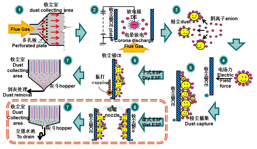 主要由殼體、進口煙箱、陰極系統、水沖洗系統(循環水系統)、高壓電源、出口煙箱、氣流分布板、電控系統等組成。