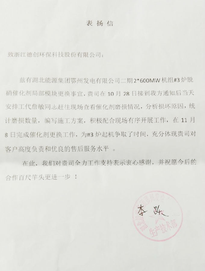 繼10月下旬德創環保連收兩封表揚信后,11月11日,公司再一次收到客戶單位的表揚信。此次表揚信由湖北能源集團鄂州發電有限公司所寫,主要感謝催化劑事業部工程服務部員工詹敏在湖北能源集團鄂州發電有限公司二期2*600MW機組#3爐脫硝催化劑局部模塊更換工程項目中,能及時到達工程現場察看催化劑磨損情況,分析損壞原因,清點磨損數量,并編寫施工方案,積極配合現場有序開展工作,僅用11天時間出色完成催化劑更換工作,為#3爐起機爭取了時間,充分體現了德創環保優良的售后服務水平和員工高度負責的精神,贏得了客戶方的認同與表揚。