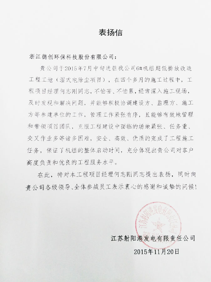 今年7月,德創環保除塵事業部進駐江蘇射陽港發電有限責任公司6#機組超低排放濕式電除塵項目改造工程現場,在接下去4個月中,除塵事業部項目執行部員工何志剛不辭辛苦,深入施工現場,及時發現排解問題,積極協調建設方、監理方、施工方等參建單位的工作,與項目團隊成功克服工程建設中面臨的場地緊張、任務重、交叉作業多等諸多困難,安全、高效、優質地完成工程施工任務,保證了機組整體啟動時間,充分體現出對客戶高度負責和優良的工程服務水平。為此,江蘇射陽港發電有限責任公司特發表揚信對楊志剛予以表揚,并對公司各級領導、全體進駐工程的員工表示衷心的感謝和誠摯的問候。