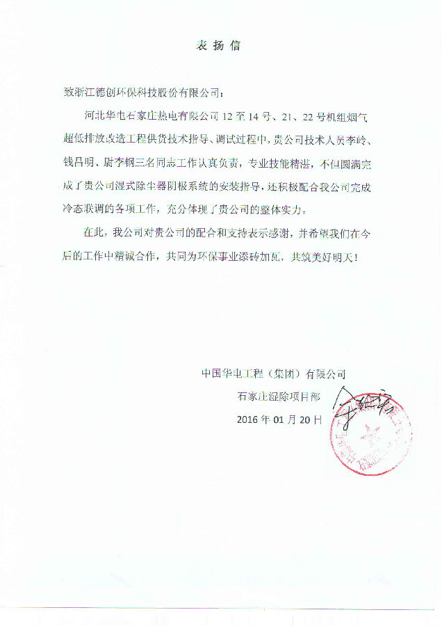 2016年才開始,德創環保就收到了客戶發來的新春首封表揚信。表揚信來自于中國華電工程(集團)石家莊濕除項目部。信中指出,在河北華電石家莊熱電有限公司12-14號、21號、22號機組煙氣超低排放改造工程供貨技術指導、調試過程中,德創環保技術人員李嶺、錢昌明、尉李鋼三名同志工作認真負責,專業技能精湛,不但圓滿完成了德創環保濕式除塵器陰極系統的安裝指導,還積極配合客戶方完成冷態聯調的各項工作,充分體現了公司的整體實力。為此,客戶方對德創環保的配合和支持表示感謝。