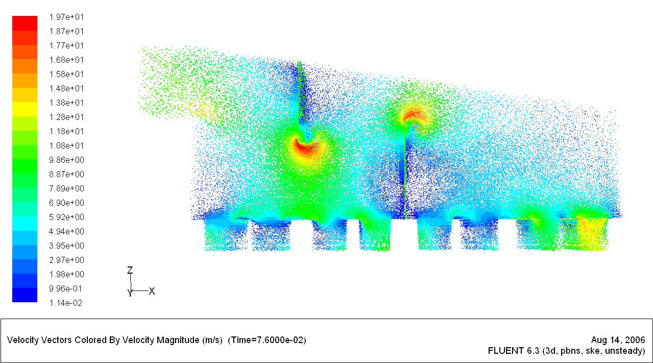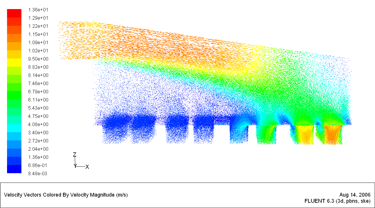 通過(guò)流場(chǎng)分析,可以很清晰的發(fā)現(xiàn),在未設(shè)置布風(fēng)分配系統(tǒng)的情況下,各個(gè)袋室的煙氣負(fù)荷極不均勻,靠近尾部的袋室煙氣負(fù)荷偏大,這樣必將導(dǎo)致尾部布袋室超負(fù)荷運(yùn)行,氣布比和氣流上升速度都將嚴(yán)重超出設(shè)計(jì)值,導(dǎo)致室差壓過(guò)大,清灰過(guò)于頻繁,甚至無(wú)法正常清灰。在設(shè)置了布風(fēng)分配系統(tǒng)以后,可以發(fā)現(xiàn),各個(gè)袋室的煙氣負(fù)荷較之前有了明顯的變化,煙氣分配也非常均勻,為清灰系統(tǒng)正常運(yùn)行提供了有力的保障。