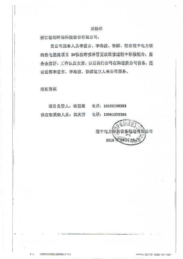 4月6日在冠中電力恒潤熱電脫硫項目2#吸收塔噴淋管更改維修過程中公司服務人員李愛古、李海波、徐瀟積極配合,以良好的服務和認真負責的工作態度贏得了冠中電力除灰設備制造有限公司的認同與表揚。