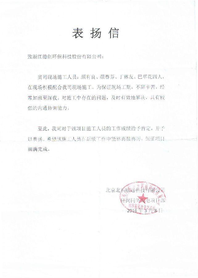 表揚信傳達出的信任令我們無比自豪,表揚信中提及的員工更是我們的驕傲,從他們身上我們看到了德創員工務實肯干的作風,德創環保仍將全力以赴,竭誠為客戶服務,共創輝煌!