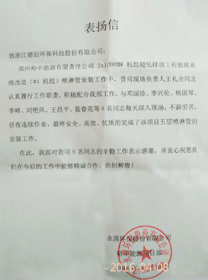 4月8日,永清環保股份有限公司裕中能源項目部發來表揚信,在鄭州裕中能源有限責任公司2*1000MW機組超低排放工程脫硫系統改造(#4機組)噴淋管安裝工作中,公司現場負責人王禮全認真履行工作職責,積極配合客戶工作,與鄧國珍、李興倫、楊國琴、李峰、劉艷鳳、王昌平、聶春花等同志每天深入現場,不分晝夜全力工作,最終安全、高效、優質地完成了該項目五層噴淋管的安裝工作。對此,永清環保股份有限公司裕中能源項目部特發表揚信對德創環保8名員工的辛勤工作予以感謝和肯定。