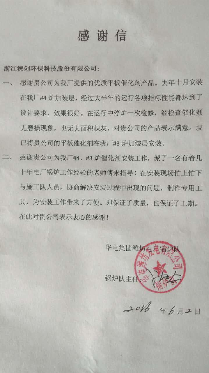 6月2日,德創(chuàng)環(huán)保收到了華電集團(tuán)濰坊電廠鍋爐隊(duì)的感謝信。信中提及,2015年10月德創(chuàng)環(huán)保為華電集團(tuán)濰坊電廠#4爐加裝層安裝平板催化劑,經(jīng)過(guò)大半年的運(yùn)行各項(xiàng)指標(biāo)均達(dá)到設(shè)計(jì)要求,效果較好。且在運(yùn)行中#4爐曾停爐檢修,經(jīng)檢查催化劑無(wú)磨損現(xiàn)象,也無(wú)大面積積灰,對(duì)此華電集團(tuán)濰坊電廠對(duì)產(chǎn)品表示滿意,現(xiàn)已將我公司的平板催化劑在#3爐加裝層安裝。