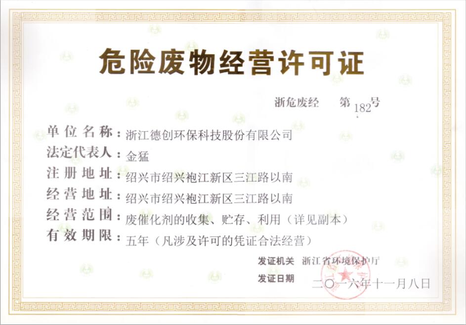 近日,德創環保獲得了由浙江省環境保護廳頒發的“危險廢物經營許可證”,經營范圍包括對廢催化劑的收集、貯存和利用。該證的獲得,將進一步提升德創環保對廢催化劑的處理能力,有助于公司盡快實現催化劑生產銷售到回收再利用的綠色循環經濟模式。