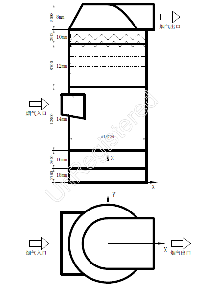入口煙道高H入口:4018mm,寬W入口:12580mm,突出塔體長度L入口:1502mm