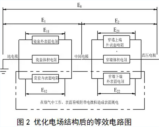 如圖3所示,改造時在瓷套的蓋板上加了1只穿墻套管,使最大爬電距離達到1050mm。而且總場強E0分別由瓷套承擔E1和穿墻承擔E2,大大減輕了瓷套的絕緣負擔。圖中瓷套與穿墻套管同軸布置,瓷套安裝在電除塵器頂棚大梁(地電極)上,瓷套的高壓端上蓋板與穿墻套管的法蘭同為等電位組成中間電極,穿過穿墻套管軸芯的陰極吊桿為高壓電極。