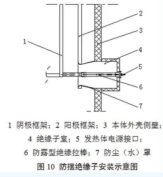 (3)將陰極框架下部絕緣板的8根金屬夾持臂換成95瓷絕緣臂,使下部防擺絕緣子的爬電距離也增加到1000mm以上。