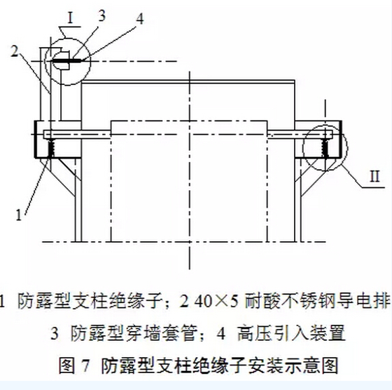 (1)在原普通工業電瓷絕緣及支撐的基礎上,每只工業電瓷套管加裝防露型穿墻套管,使絕緣子的總爬電距離達1000mm,用增加爬電距離方法來避免和解決瓷瓶內壁爬電問題。
