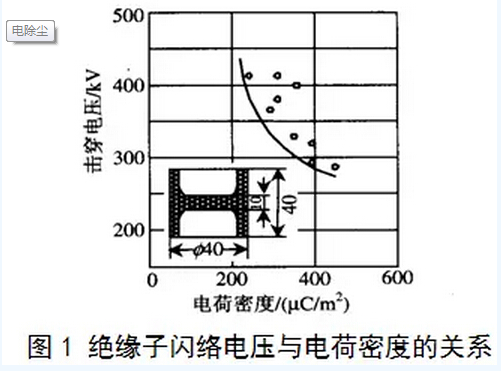 圖1為日本三菱公司K.Nakanishi, A.Yoshioka[2]等人對中間實心的圓桶形絕緣子模型施加一系列直流電壓后,得到的絕緣子表面擊穿電壓隨電荷密度的關系