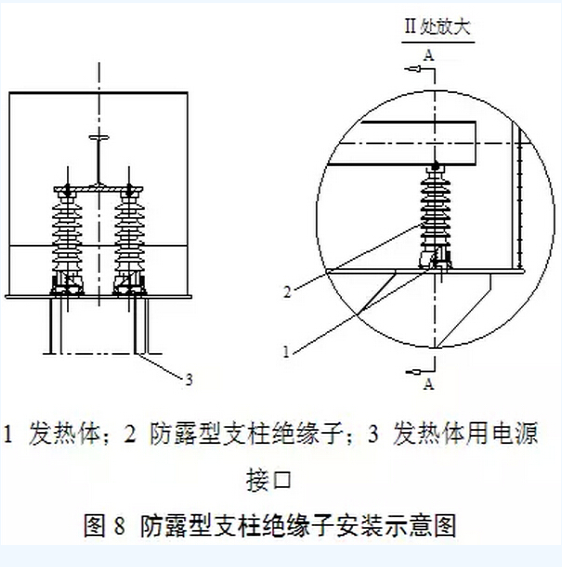 防露型支柱絕緣子一般采用2只一組,安裝在電除塵器的頂部抬著陰極吊桿,也可從陰極框架的側部伸出懸臂梁,將4只防露型支柱安裝在電除塵器本體兩側外的框架上,抬著陰極框架。防露