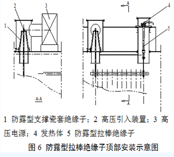 防露型拉棒絕緣子可用于懸吊總重為10噸的陰極框架,低低溫電除塵器一個供電分區的4個吊點的絕緣分別安裝3只防露型絕緣拉棒和1只防露型支撐瓷套絕緣子,其安裝如圖6所示。防露型拉
