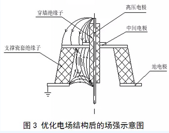 在瓷套內壁與穿墻套管下部外壁之間的電場E套內實際上是由E12和E22組成, E12與E22為同軸電場,且方向相反,即E套內= E22-E12,可見,如此布置瓷套內的場強由于E12和E22相互抵消而減小,使吸附在絕緣子表面的帶電微粒失去動力,無法遷移,避免絕緣子表面出現沿面放電。
