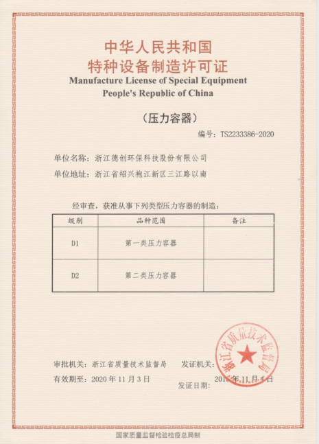 11月4日,德創環保獲得了由浙江省質量技術監督局頒發的壓力容器制造許可證。此次壓力容器制造許可證的取得,對于德創環保具有重要意義。德創環保將以此為契機,再接再厲,為中國的環保事業貢獻自己的一份力量!