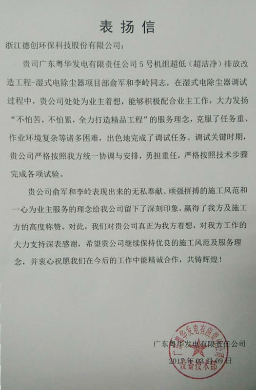 近日,德創環保收到來自廣東粵華發電有限責任的表揚信。信中指出,在廣東粵華發電有限責任公司5號機組超低(超潔凈)排放改造工程-濕式電除塵器項目中,公司員工俞軍和李嶺在濕式電除塵器調試過程中處處為業主著想,積極配合業主工作,大力發揚“不怕苦,不怕累,全力打造精品工程”的服務理念,克服了任務重、作業環境復雜等諸多困難,出色完成了調試任務。尤其在調試關鍵時期,德創環保能按照業主方要求進行統一協調與安排,勇擔責任,嚴格按照技術步驟完成各項試驗。而俞軍與李嶺表現出來的無私奉獻、頑強拼搏的施工風范和一心為業主服務的理念,更給業主單位留下深刻印象,贏得了業主方的高度稱贊。對此,業主方特發表揚信深表肯定。