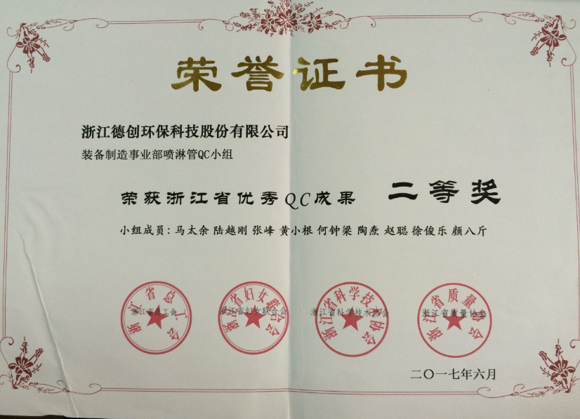 6月30日,在浙江省質量協會舉辦的2017年浙江省優秀質量管理小組(QC小組)活動評選中,德創環保裝備制造事業部噴淋管QC小組的“提高噴淋管管口合格率”表現出色,喜獲浙江省優秀QC小組活動成果二等獎。
