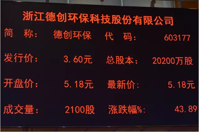2017年2月7日,浙江德創(chuàng)環(huán)保科技股份有限公司在上海證券交易所主板成功上市,股票簡(jiǎn)稱“德創(chuàng)環(huán)保”,股票代碼為603177。公司將以上市為契機(jī),借助資本市場(chǎng)的力量,為我國(guó)能源環(huán)保產(chǎn)業(yè)作出更大更積極的貢獻(xiàn)。