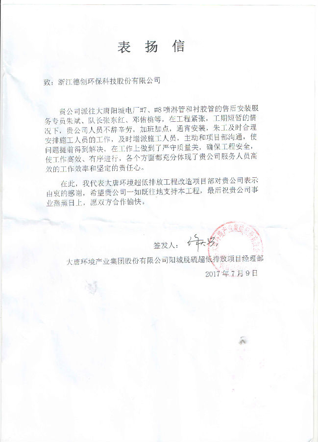 近日,德創(chuàng)環(huán)保收到了來自大唐環(huán)境產業(yè)集團股份有限公司陽城脫硫超低排放項目經理部的表揚信。信中提及德創(chuàng)環(huán)保派往大唐陽城電廠#7、#8噴淋管和襯膠管的售后安裝服務專員朱斌、施工隊長張東紅、鄧佑桃等員工,在工程緊張、工期短暫的情況下,不辭辛勞,加班加點,及時合理安排好施工人員的工作,使項目問題提前得以解決,在工作上做到嚴守質量關,確保工作高效有序進行,充分體現(xiàn)了德創(chuàng)環(huán)保員工高效的工作效率和堅定的責任心。對此大唐環(huán)境產業(yè)集團股份有限公司陽城項目經理部特寫表揚信予以感謝。