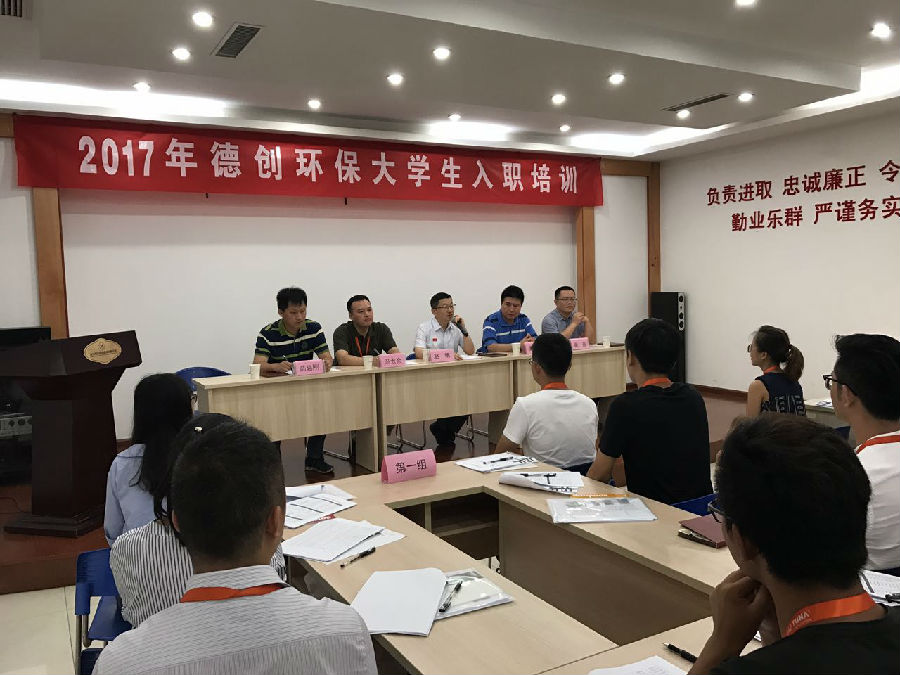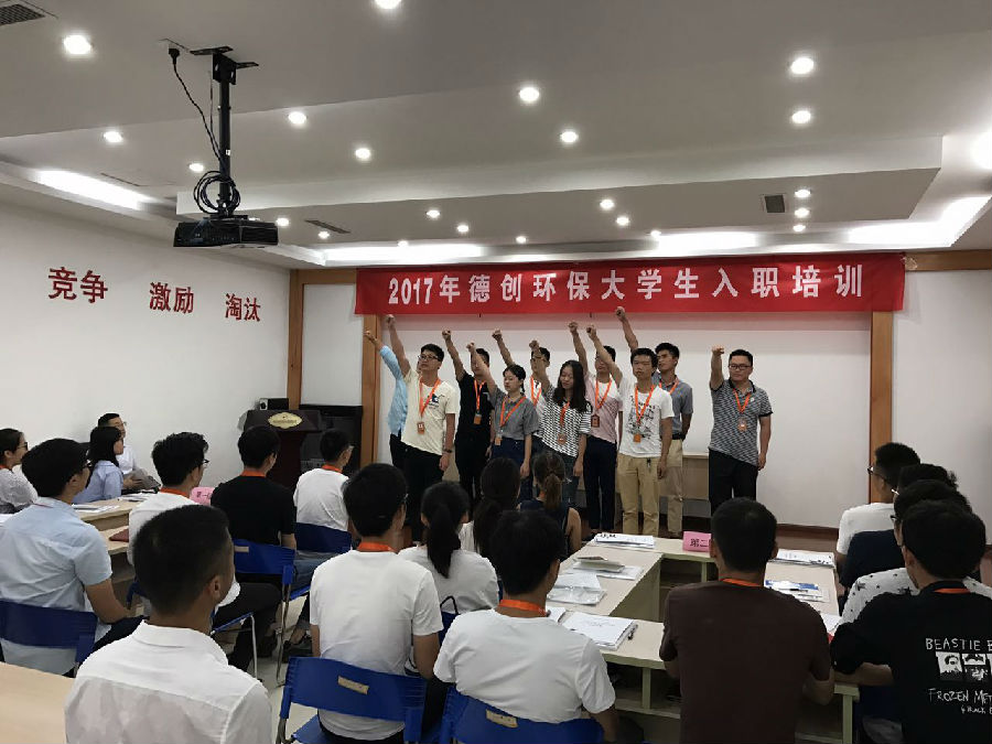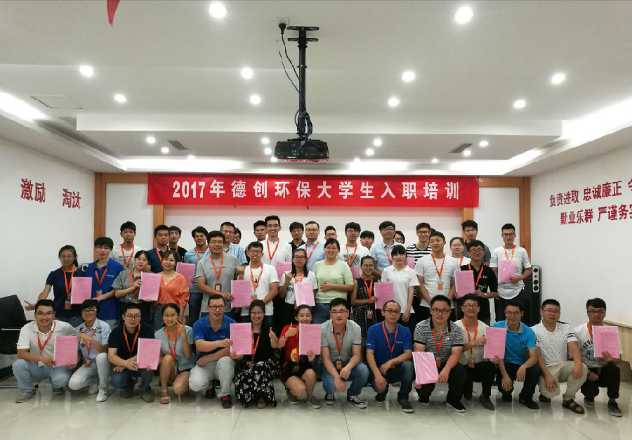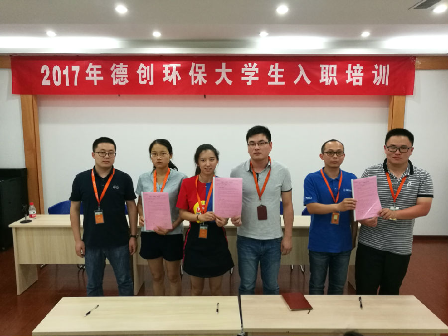 近日,德創環保舉行2017屆大學生新員工“傳幫帶”簽約儀式,50名大學生新員工與各自的職場指導人齊聚一堂參加此次簽約儀式,公司總裁趙總、副總裁馬總、環保工程事業部副總姜偉、裝備制造事業部副總陸越剛、人力資源管理中心總監謝吉到席。