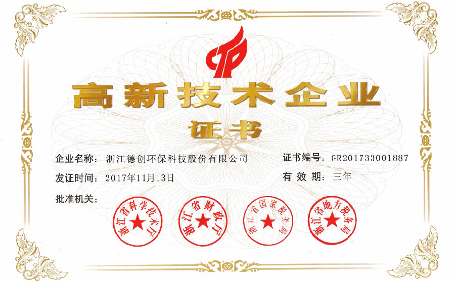 1月11日,德創(chuàng)環(huán)保收到浙江省科學技術(shù)廳、浙江省財政廳、浙江省國家稅務局和浙江省地方稅務局聯(lián)合頒發(fā)的《高新技術(shù)企業(yè)證書》。