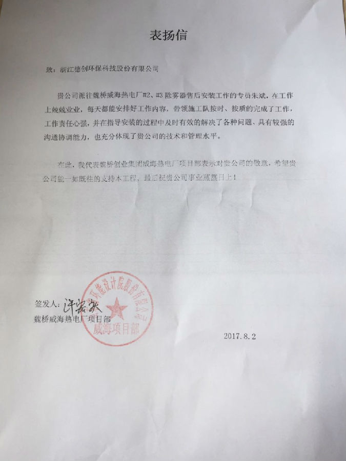 近期,德創環保收到了一封來自山東環能設計院威海項目部的表揚信。信中指出,在魏橋威海熱電廠#2#3除霧器的售后安裝中,公司員工朱斌在工作中兢兢業業,每天都能安排好工作內容,帶領施工隊按時、按質地完成了工作,并在指導安裝的過程中及時有效的解決了各種問題,具有較強的溝通協調能力,贏得了業主方的高度稱贊。