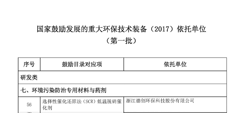 德創環保憑借“選擇性催化還原法(SCR)低溫脫硝催化劑“成功入選,成為國家鼓勵發展的