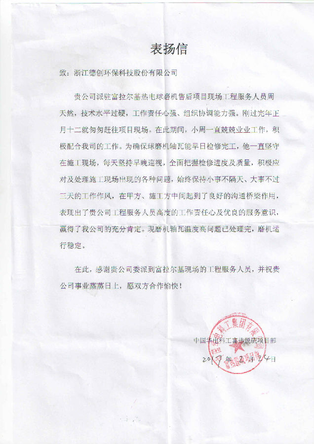 首先是中國(guó)華電科工富熱脫硫項(xiàng)目部發(fā)來(lái)的表?yè)P(yáng)信。表?yè)P(yáng)信中指出,德創(chuàng)環(huán)保富拉爾基熱電球磨機(jī)售后項(xiàng)目現(xiàn)場(chǎng)工程人員周天然,技術(shù)水平過(guò)硬,能積極配合業(yè)主工作,及時(shí)應(yīng)對(duì)及處理施工現(xiàn)場(chǎng)出現(xiàn)的各種問(wèn)題,做到“小事不隔天、大事不過(guò)三天”,在甲方、施工方中間起到了良好的溝通橋梁作用,表現(xiàn)出德創(chuàng)環(huán)保工程服務(wù)人員高度的工作責(zé)任心及優(yōu)良的服務(wù)意識(shí),贏得了業(yè)主的充分肯定。