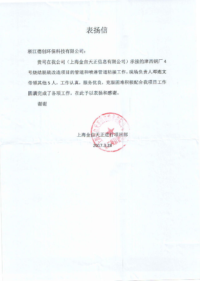 除此之外,上海金自天信息有限公司項(xiàng)目部也特發(fā)表?yè)P(yáng)信。在德創(chuàng)環(huán)保承接的津西鋼廠4號(hào)燒結(jié)脫硫改造項(xiàng)目的管道和噴淋管道粘接工作中,德創(chuàng)環(huán)保現(xiàn)場(chǎng)負(fù)責(zé)人鄧連文等同志工作認(rèn)真,服務(wù)優(yōu)良,克服困難積極配合業(yè)主項(xiàng)目工作,圓滿(mǎn)完成了各項(xiàng)任務(wù),特在此予以表?yè)P(yáng)與感謝。