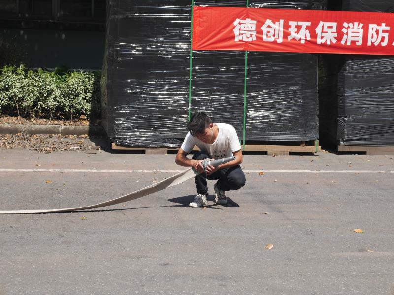 第二個環節是“接水帶”,每人手握一根水帶依次拋出,要在最短的時間內將兩根水帶接好,一頭裝上水槍,直到拉直為止,用時最短為勝。