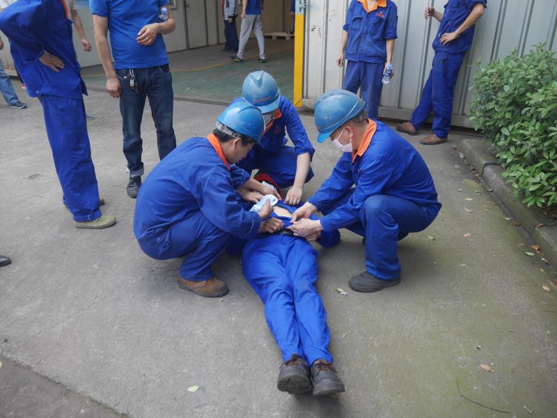 高溫酷暑天來臨,考慮到車間一線員工易發生中暑現象,特設置“中暑休克急救”環節。當出現這種狀況,首先將中暑者快速抬離高溫區,在通風處,立即脫去上衣并用帶酒精的毛巾為其擦拭身體降溫。