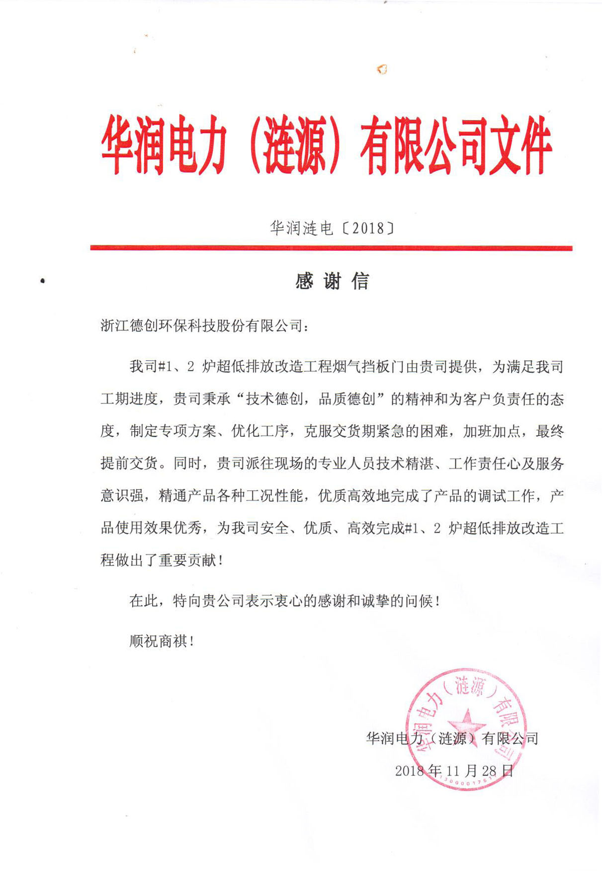 收獲肯定,德創(chuàng)環(huán)保收華潤電力感謝信
