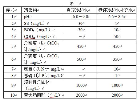 電廠用水主要為循環(huán)冷卻水補水及鍋爐補給水水源。循環(huán)冷卻水補水水質(zhì)可參照以下表二水質(zhì)標準。
