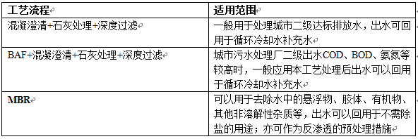 城市污水處理廠二級出水作為電廠水源需綜合分析中水來水水質(zhì)情況,結(jié)合以上幾種工藝系統(tǒng)的技術(shù)經(jīng)濟比較、當?shù)丨h(huán)保部門要求及廠區(qū)總平面規(guī)劃等最終確定適用于不同工程條件的工藝流程系統(tǒng)。