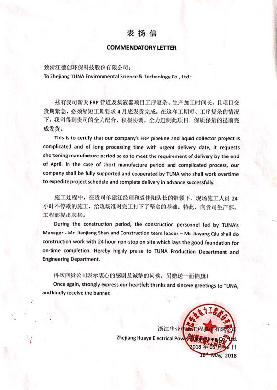 德創(chuàng)環(huán)保珍視每一封客戶發(fā)來(lái)的表?yè)P(yáng)信,因?yàn)槠溟g承載的客戶對(duì)德創(chuàng)的信任與肯定,而這更堅(jiān)定了德創(chuàng)環(huán)保“打造精品工程、全力服務(wù)客戶”的信心與決心。德創(chuàng)環(huán)保將繼續(xù)保持優(yōu)良的施工風(fēng)范及服務(wù)理念,與客戶精誠(chéng)合作,共鑄輝煌!