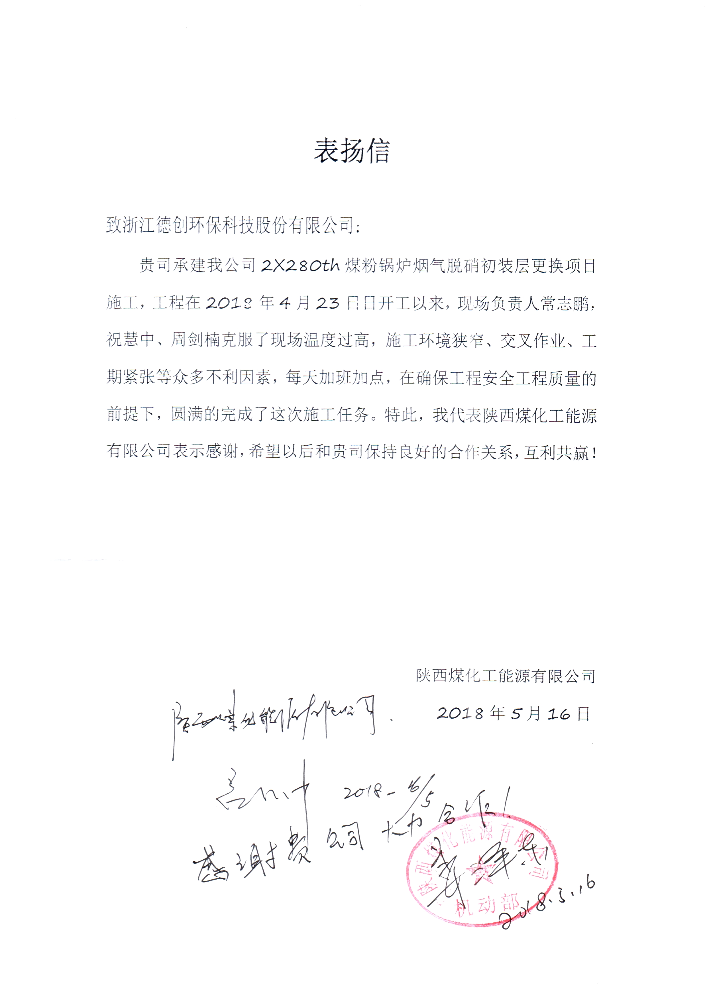 近期,德創環保收到了一封來自陜西煤化工能源有限公司的表揚信。信中指出,在承建的該公司2*280噸煤粉鍋爐煙氣脫硝初裝層更換項目施工,自開工以來,現場負責人常志鵬、祝慧中、周劍楠等人克服了現場溫度過高,施工環境狹窄、交叉作業、工期緊張等眾多不利因素,每天加班加點,在確保工程安全質量的前提下,圓滿的完成了此次施工任務,贏得了客戶方的認可與感謝!