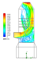 圖3為導流環邊長200mm時吸收塔內速度分布。當增加導流板邊長為200mm,覆蓋率為6.8%,此時由于吸收塔左側導流環結構對煙氣產生的影響不可忽視,使得雖然右側導流環改善了爬壁現象,但隨著左側結構影響的加劇,爬壁現象仍不能較好的改善。