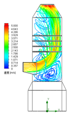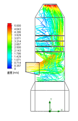 圖9為導流環邊長300mm時吸收塔內流線分布。當導流板覆蓋率為10.1%時,導流板的擾流效果明顯,貼壁面流線速度接近為零。