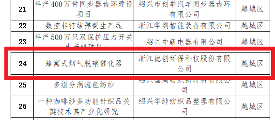 德創環保“蜂窩式煙氣脫硝催化劑”被評選為紹興市發明專利產業化項目