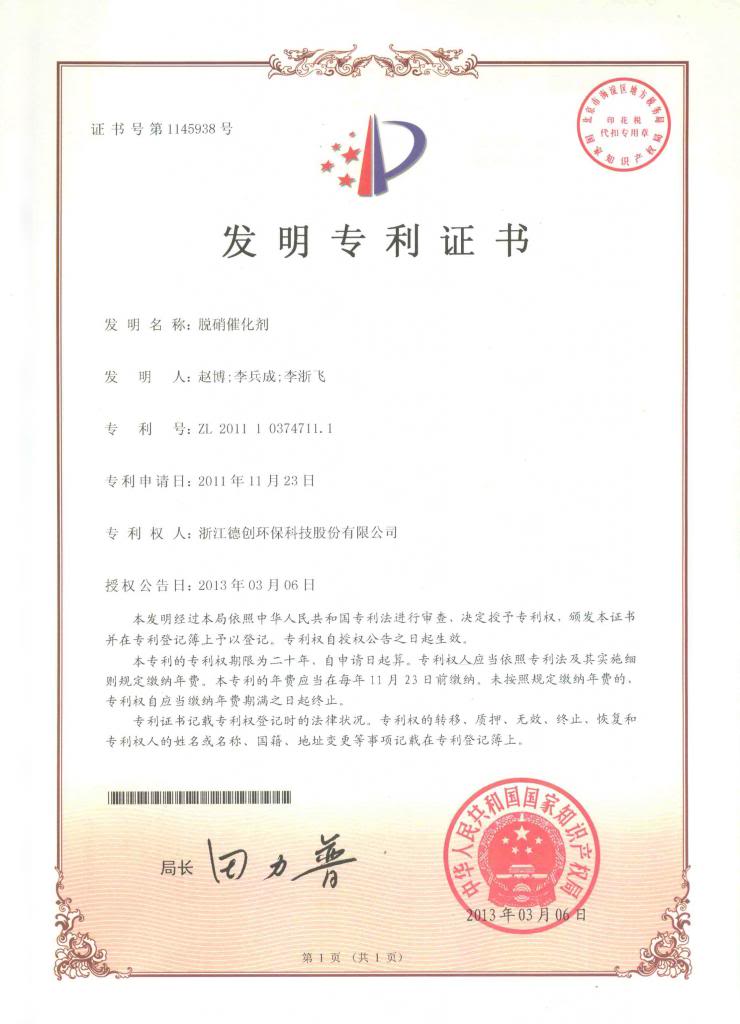 脫硝催化劑專利授權喜報 2014-06-02 09:50:14 2012年3月6日,公司核心產品脫硝催化劑獲得國家知識產權局授予發明專利證書。該專利的授予,提升了公司煙氣脫硝技術領域的自主創新能力。促進了公司脫硝催化劑的市場競爭力!